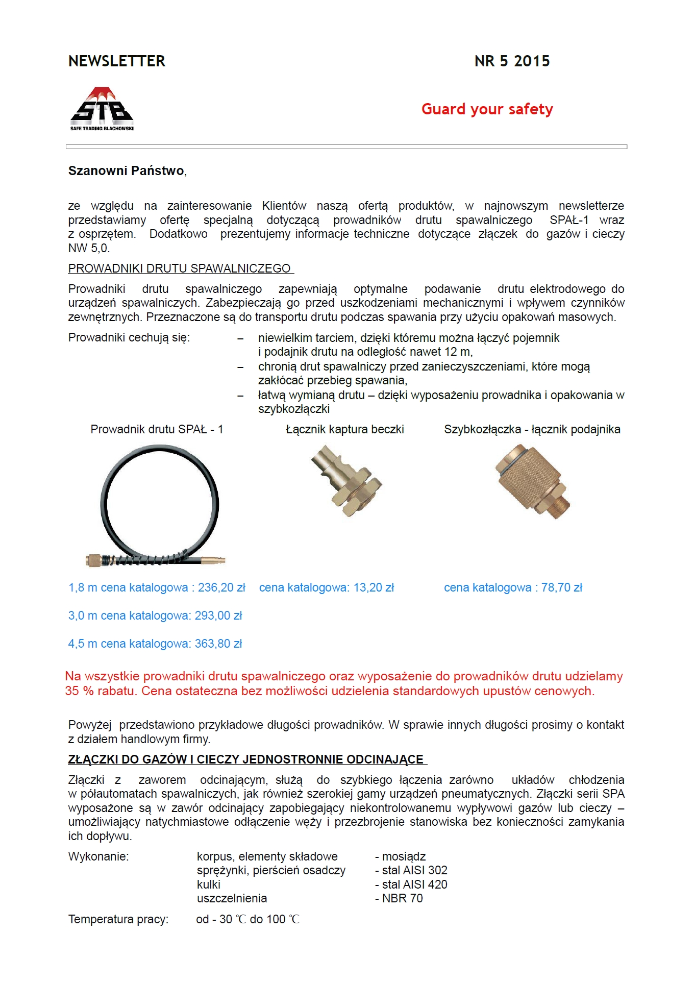 ze względu na zainteresowanie klientów naszą ofertą produktów, w najnowszym newsletterze przedstawiamy ofertę specjalną dotyczącą prowadników drutu spawalniczego SPAŁ-1 wraz z osprzętem. Dodatkowo prezentujemy informacje techniczne dotyczące złączek do gazów i cieczy NW 5.0